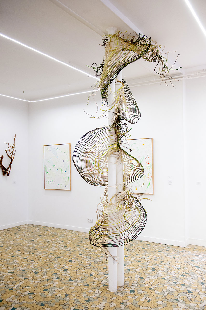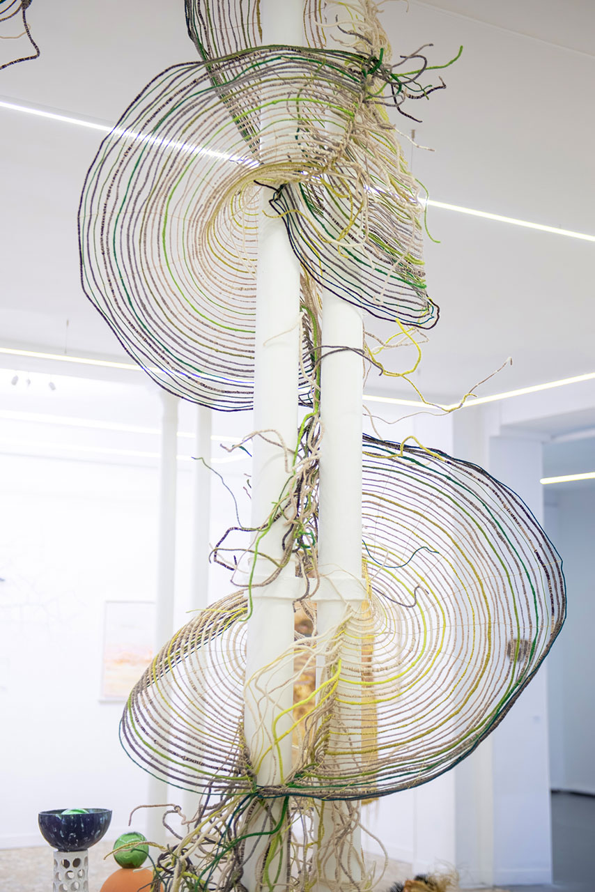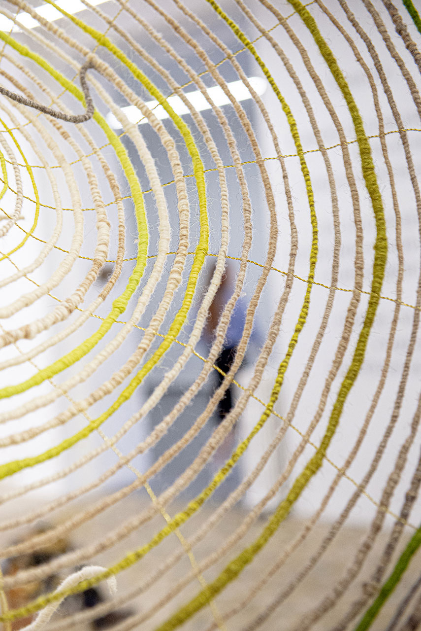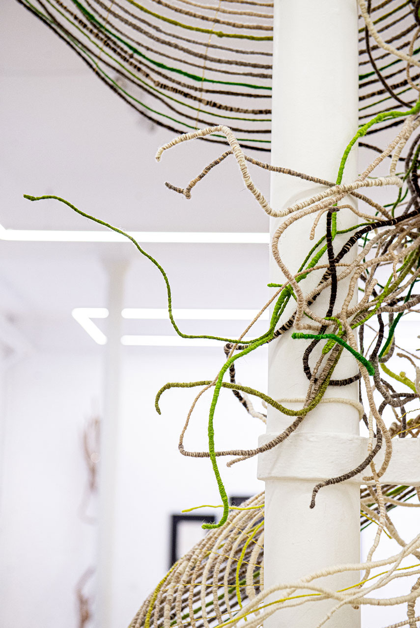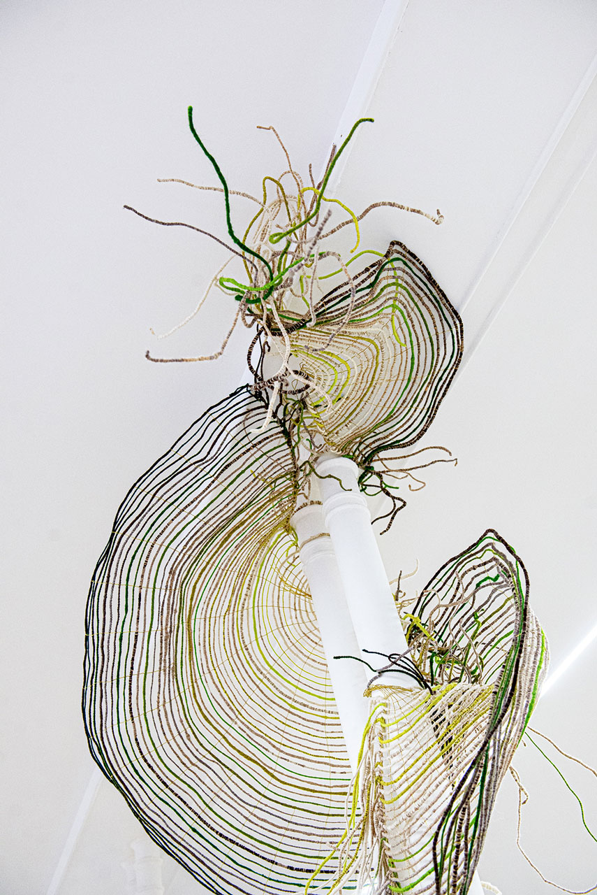 Six arches qui s’enroulent en un mouvement continu et laissent filer derrière elles leurs traînes colorées. Elles sont inspirées de la lumière qui traverse la canopée, de la fluidité des matières et des couleurs en forêt. Sur le lieu de représentation, elles s’agrippent aux éléments architecturaux, se modèlent. Leur tressage délicat de laine et de laiton orne l’espace d’une nappe diffuse, brume glissante aux tonalités fuyantes.