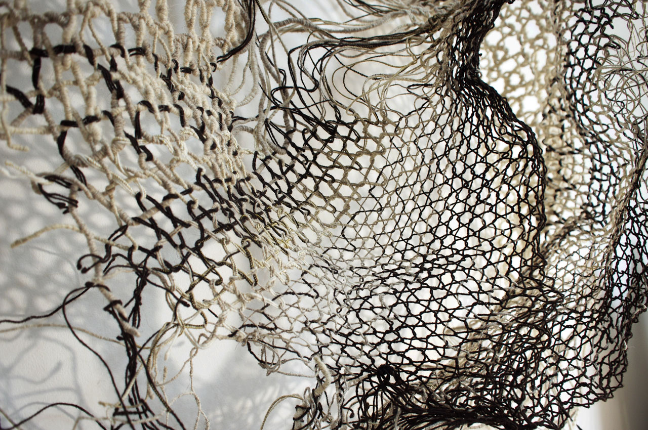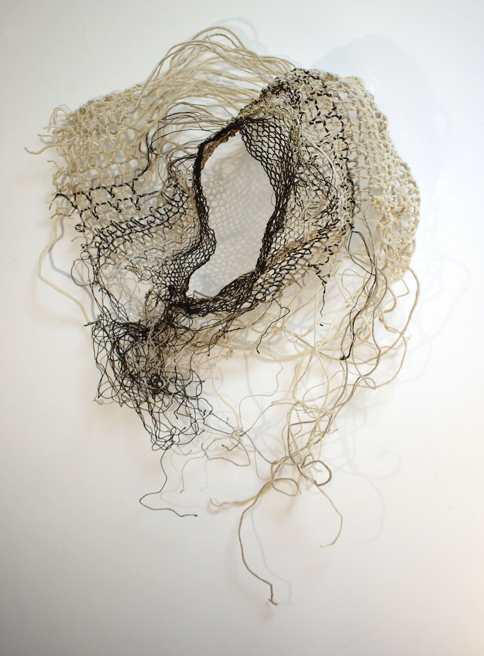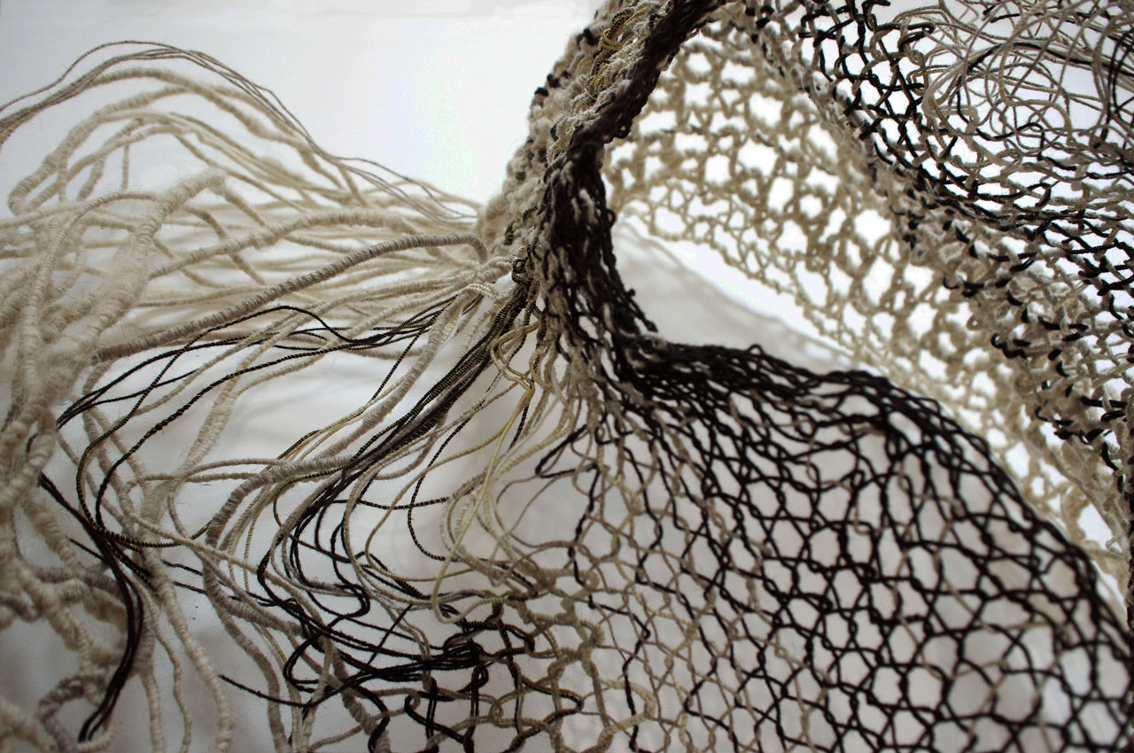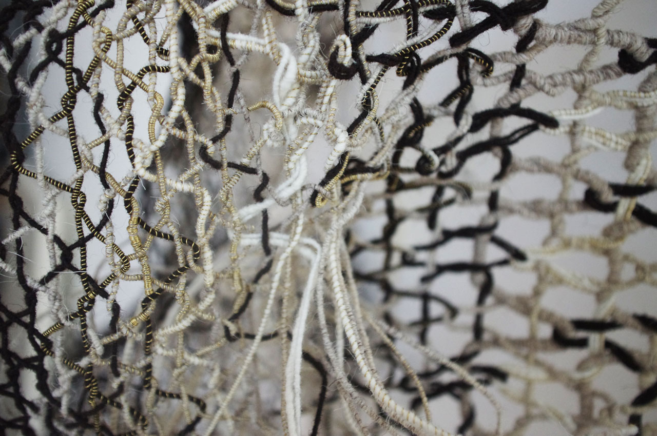 Lors de randonnées en montagne, Céline incorpore les lignes vibrantes, cachées ou affleurantes du paysage. A l’atelier, elle les transcrit par le fil, dans un processus emprunté à la dentelle, où le geste d’entrecroisement vient associer les lignes en un corps solidaire.